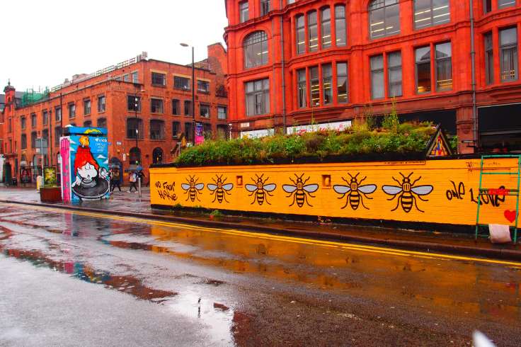 Por cierto, un dato curioso ¿Sabíais que el símbolo de Manchester son las abejas? Están por todos lados: papeleras, murales, señales… y es que es las abejas son obreras y si por algo es conocido Manchester es por ser una ciudad industrial en la que siempre se ha luchado por sus derechos. Además tras el atentado del pasado mes de mayo, la gente lo ha empezado a utilizar como un símbolo de unión contra el miedo. Nos parece preciosa la unidad de una ciudad contra este tipo de sucesos.