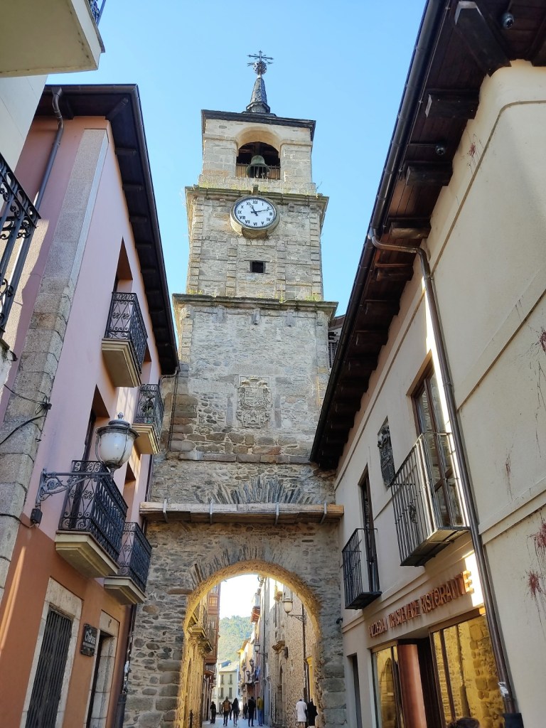 Al salir del museo te encontrarás con la Torre del Reloj, uno de los lugares y monumentos más conocidos de Ponferrada. Se ubica sobre el Arco de las Heras, la única puerta que se conserva de la muralla medieval. La torre data del s. XVI, aunque en aquel momento aún no contaba con la parte superior de la torre, dónde está el reloj, si no que se añadió a finales del s. XVII.