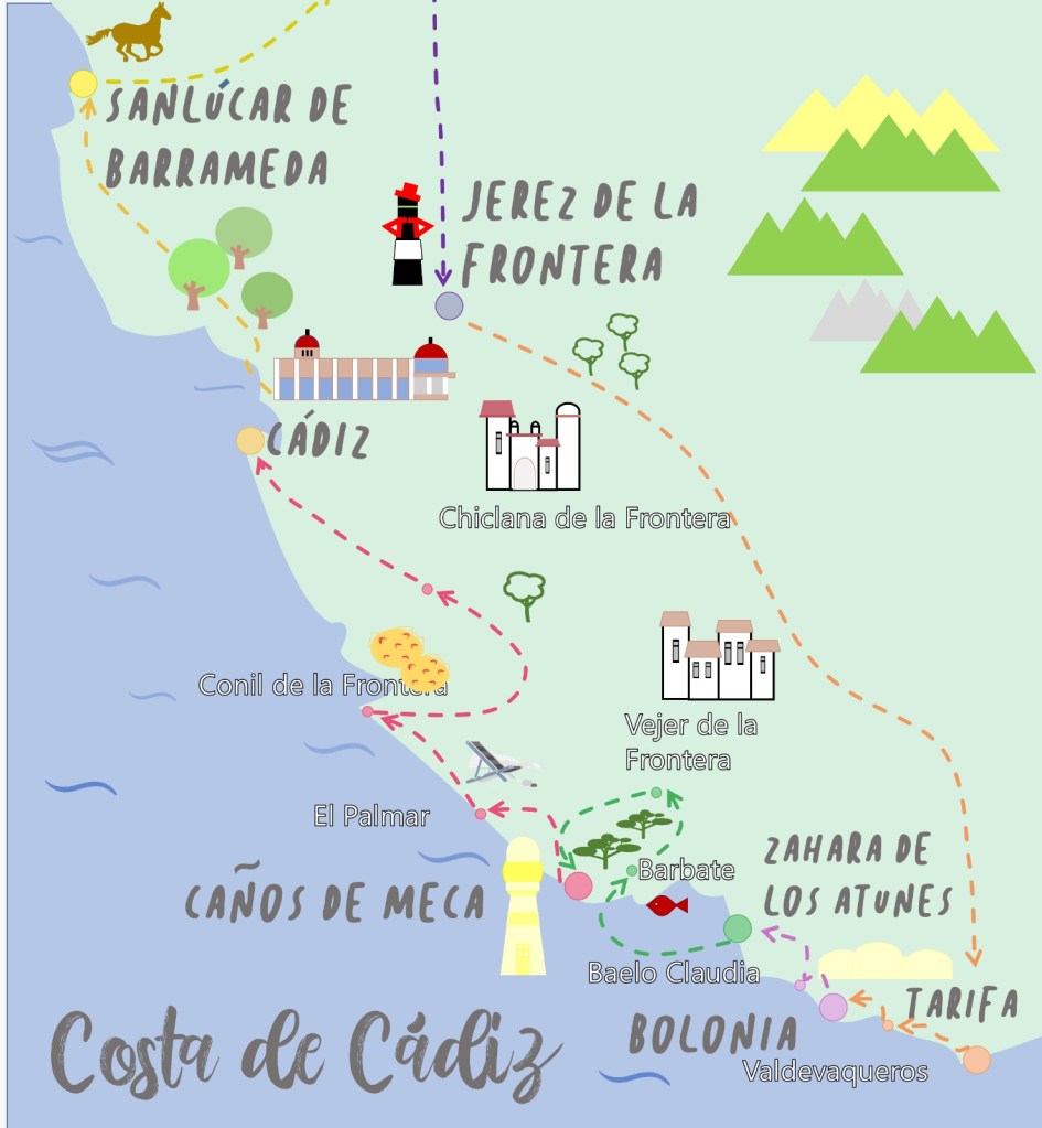 Aquí os dejamos el mapa ilustrado de nuestra ruta en autocaravana por la costa de Cádiz: