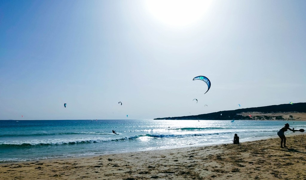 El buen tiempo continuaba así que decidimos aprovechar e ir de nuevo a la playa. Tras comer pusimos rumbo a la playa de Valdevaqueros, dónde pudimos ver como practicaban kitesurf. Desde allí fuimos a ver la Duna de Valdevaqueros porque en Google marcaba como que había una carretera ¡error! si viajas en AC o furgo grande ni lo intentes, quédate en la zona de aparcamiento de abajo y vete andando. Lo decimos por experiencia.