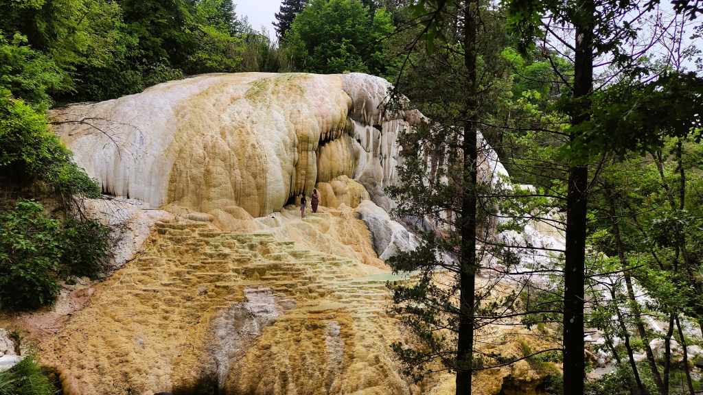 Nuestro siguiente destino fue Bagni San Filippo, un pequeño paraíso natural es famoso por sus aguas termales al aire libre, rodeado de bosque y formaciones calcáreas, lo que hace que el entorno sea simplemente relajante y perfecto. Para llegar a estas termas tienes que seguir el sendero «Fosso Bianco» que va paralelo al río e irás encontrando las diferentes pozas. La estrella del lugar es la Balena Bianca, una cascada de piedra que parece la boca de una ballena.