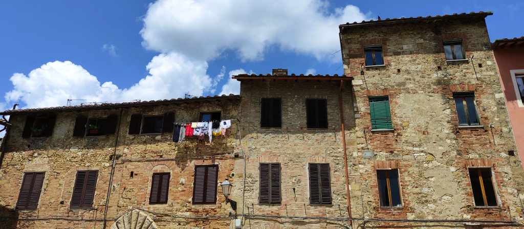 El siguiente destino fue Castiglioni, fue un desvío más tranquilo, menos turístico, pero con ese aire auténtico que tanto nos gusta. Calles silenciosas, fachadas de piedra y flores por todas partes. Fue una parada breve, pero perfecta para respirar la Toscana más auténtica y sin filtros. A pocos kilómetros paramos en Colle di Val d’Elsa. Nos sorprendió su casco antiguo, lleno de historia y elevado ¡muy elevado! Hay un ascensor que te sube pero cuando fuimos nosotros estaba estropeado y nos tocó subir andando. La verdad es que mereció la pena, pasear por las callejuelas silenciosas, visitar el Duomo y el Palazzo Pretorio, ver talleres de cristal y disfrutar de las vistas preciosas.