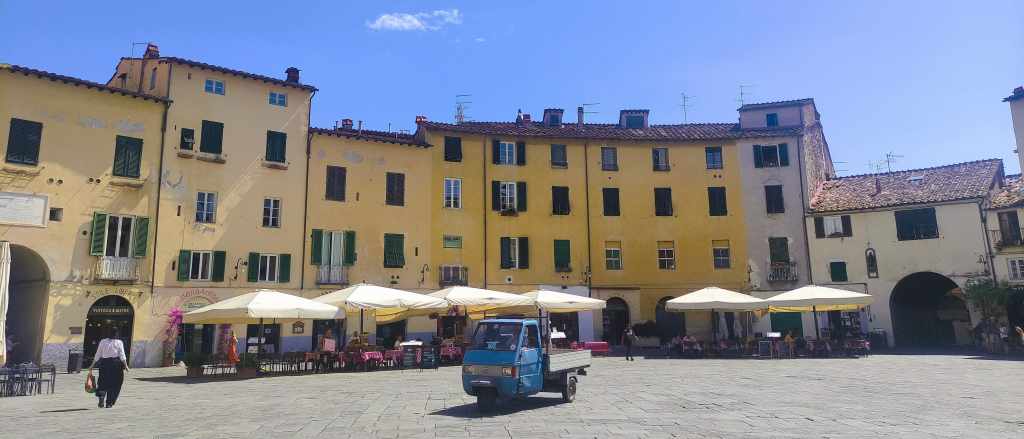 Por la tarde llegamos a Lucca, y fue amor a primera vista. Esta ciudad amurallada es un auténtico tesoro. Entramos caminando por una de sus puertas medievales y nos dejamos llevar por sus calles adoquinadas, plazas escondidas y fachadas llenas de historia. Subimos a la Torre Guinigi, famosa por los árboles que crecen en su cima, y desde allí disfrutamos de una vista panorámica de tejados y campanarios. Paseamos por la Piazza dell’Anfiteatro, una plaza ovalada construida sobre un antiguo anfiteatro romano.