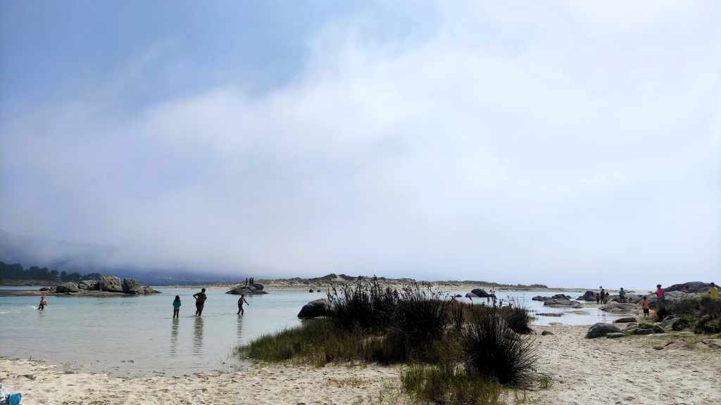 Después de comer, pusimos rumbo hacia la Playa da Barreira. Nos metimos por una pista de tierra sin ver una señal que (luego supimos) prohibía el acceso a autocaravanas. El terreno y la pendiente fueron una trampa mortal para nuestro vehículo. El embrague se llevó tal calentón que el olor y la tensión de no saber si saldríamos de allí nos dejaron agotados. Fue el momento más crítico y angustioso de todo el viaje. Con el embrague «tocado» y nosotros todavía temblando por la tensión, decidimos que lo mejor era terminar el día en el Camping O Paraíso. Necesitábamos parar. Para desconectar después de un día tan ajetreado y tensionado, nos fuimos a la playa de enfrente, do Lago. Caminar por la arena con el sonido del mar fue la mejor terapia para relajarnos y asimilar que, por suerte, todo había quedado en un susto.