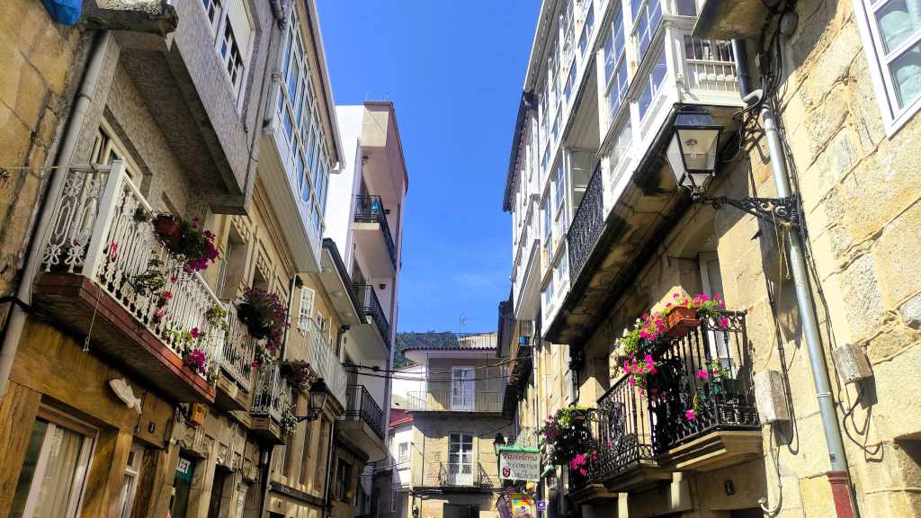 Hoy el viaje cambió de ritmo. Dejamos atrás la costa más salvaje para adentrarnos en las rías y terminar en el corazón de Galicia. Empezamos recorriendo este pueblo, que es uno de los mejores conservados de Galicia. Nos encantó perdernos por su centro histórico, especialmente por la Rúa Real. Es fascinante ver sus casas con soportales de piedra; nos contaron que allí los marineros arreglaban las redes a cubierto y vendían el pescado directamente. Paseamos hasta el Mercado de Abastos para ver el ambiente local y subimos hacia la Colegiata de Santa María, que domina el pueblo desde lo alto con una presencia imponente.