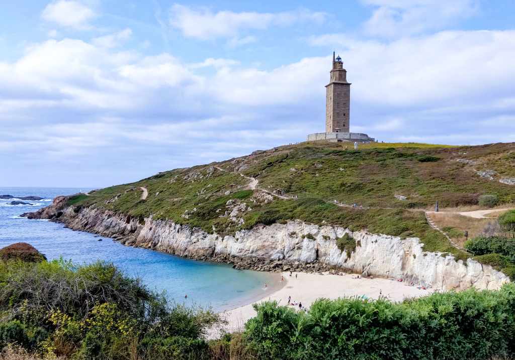 Volvimos hacia la autocaravana recorriendo un trozo del Paseo Marítimo, viendo cómo las olas bañaban las playas de Riazor y Orzán Como aún era pronto y hacía buenísimo, bajamos a la Playa de las Lapas, que está justo al lado de la Torre de Hércules. Es una cala recogida y preciosa. Disfrutamos de un rato de playa increíble con una perspectiva única del faro desde la arena. Estar allí sentados, con la mole de piedra vigilándonos y el azul del mar, fue de lo más especial del día. Coruña nos dejó con el corazón lleno (y el estómago también).