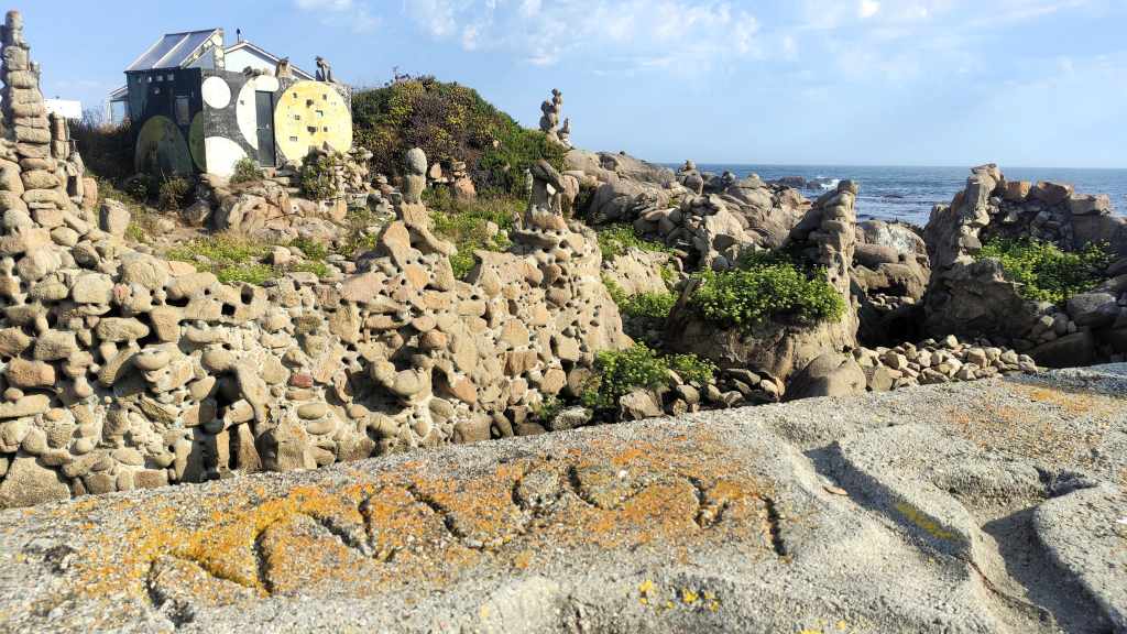 Este fue, sin duda, el día más intenso del viaje. Nuestra primera parada fue Camelle. Visitamos el legado de «Man, el alemán de Camelle» y es sencillamente espectacular. Ver sus esculturas de piedra y formas orgánicas integradas en el espigón es algo único. Es una obra de arte al aire libre que transmite una paz y un misterio muy especiales.